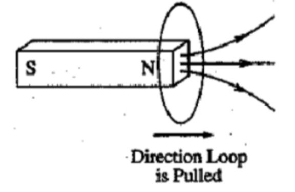A strong bar magnet is held very close to the opening of a solenoid as shown in the diagram. As the magnet is moved away from the solenoid at constant speed, what is the direction of conventional current through the resistor shown and what is the direction of the force on the magnet because of the induced current?