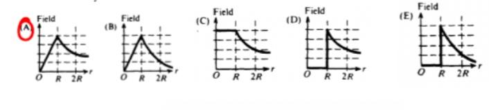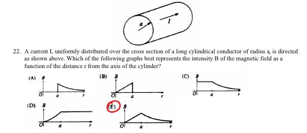 A current I, uniformly distributed over the cross section of a long cylindrical conductor of radius a, is directed as shown above. Which of the following graphs best represents the intensity B of the magnetic field as a function of the distance r from the axis of the cylinder?