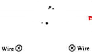 Two very long parallel wires carry equal currents in the same direction into the page, as shown above. At point P, which is 10 centimeters from each wire, the magnetic field is