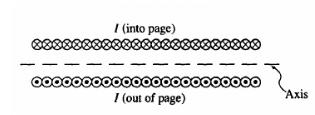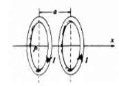 The two rings each carry a current I, but in opposite directions. At point P, the center of the ring on the left the magnetic field due to these currents is