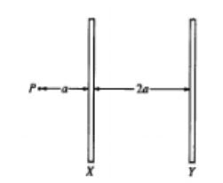 Two long parallel wires are a distance 2a apart, as shown above. Point P is in the plane of the wires and a distance a from wire X. When there is a current I in wire X and no current in wire Y, the magnitude of the magnetic field at P is Bo. When there are equal currents I in the same direction in both wires, the magnitude of the magnetic field at P is