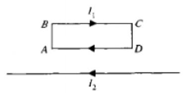 A rigid, rectangular wire loop ABCD carrying current I1 lies in the plane of the page above a very long wire carrying current I2: