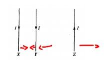 The currents in three parallel wires, X, Y, and Z, each have magnitude l and are in the directions shown above. Wire Y is closer to wire X than to wire Z. The magnetic force on wire Y is