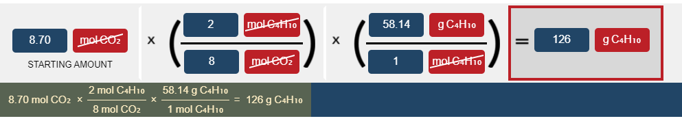 etermine the number of grams of C₄H₁₀ that are required to completely react to produce 8.70mol of CO₂ according to the following combustion reaction: 2C₄H₁₀(g)+13O₂(g)→8CO₂(g)+10H₂O(g)