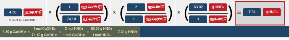 How many grams of nitric acid, HNO₃ ,are required to neutralize (completely react with) 4.30g of Ca(OH)₂according to the acid-base reaction: 2HNO₃(aq)+Ca(OH)₂(aq)→2H₂O(l)+Ca(NO₃)₂(aq)