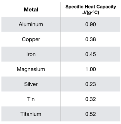 If 801 J of heat is available, what is the mass in grams of iron (specific heat = 0.450 J/g・°C) that can be heated from 22.5°C to 120.0°C?