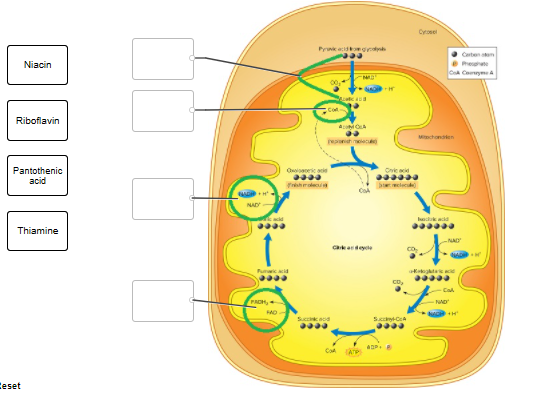 Several B vitamins act as coenzymes for the cellular respiration reactions. Indicate which B vitamin is involved at each labeled point in the pathway.