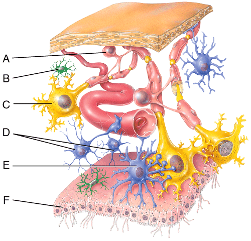 Which of the labeled cells in the diagram is a neuroglial cell that removes debris and acts as a phagocyte?