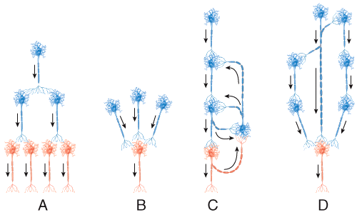 Which diagram represents the type of circuit commonly used to send sensory signals to multiple areas of the brain?
