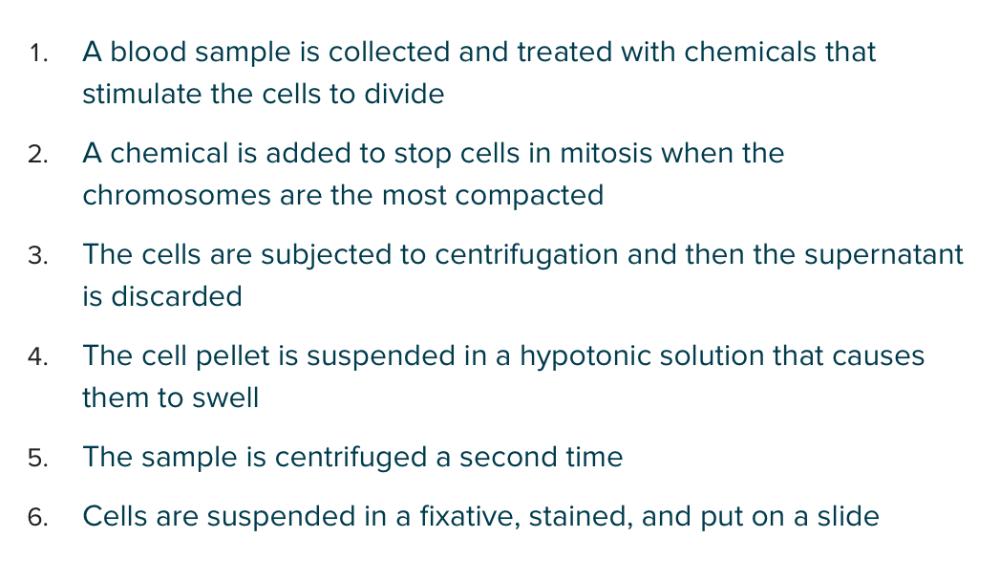 The following are steps used in the procedure for making a karyotype. Arrange them in order, starting with the first step at the top.