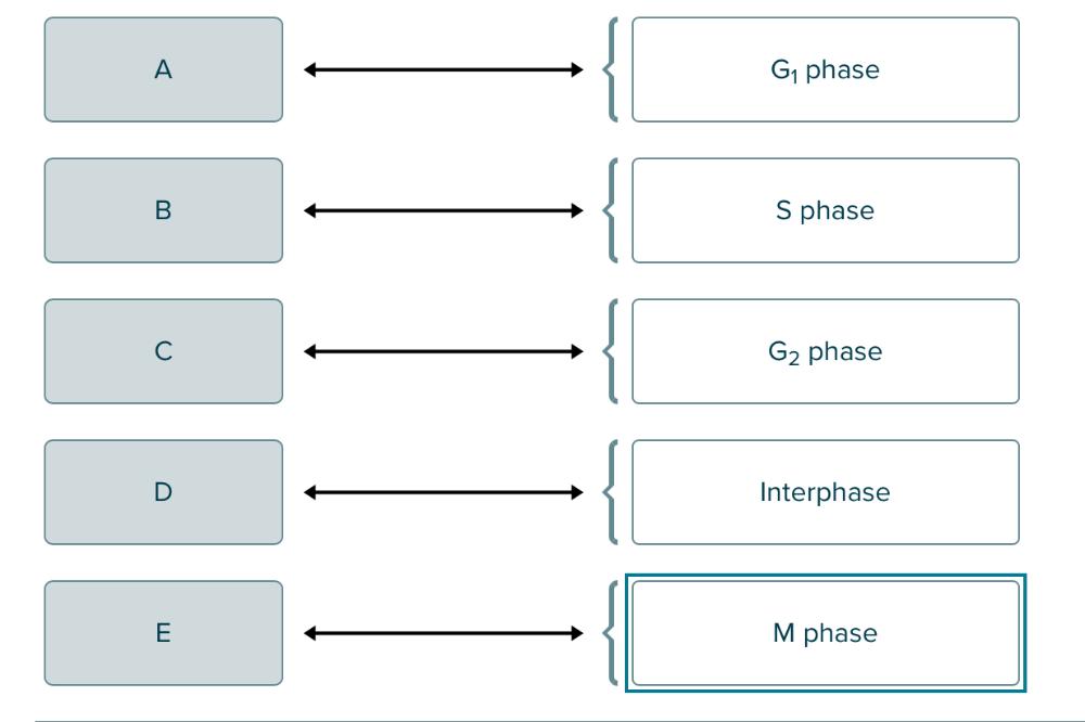 This figure depicts the cell cycle in eukaryotes, including the M phase. Match the letter to the appropriate phase.