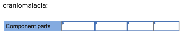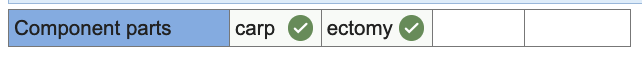 Break down the following word into its component parts. Enter each component part into one cell, with no slashes or spaces. Use as many cells as necessary – you may not need all cells provided. If no entry is required, leave the cell empty. For example, nasopharyngoscope = naso | pharyngo | scope
