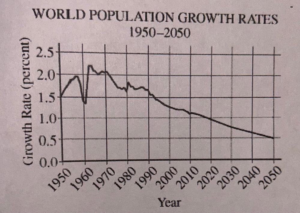 The world population growth rate in 2015 is about one percent. It is expected to drop to 0.5% by 2050, partly because of increased access to birth control and developing nations. Another likely caused where the expected decline is