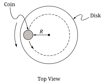 A horizontal disk rotates at a constant angular speed ω. As viewed from above, a coin of mass m on the disk moves counterclockwise in a circle of radius R, as shown.
