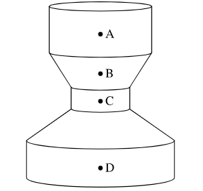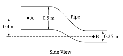 An ideal fluid with density 960kg/m3 fills the pipe shown in the side view and flows through it. The pipe has a circular cross section, and the speed of the fluid at Point A is 0.6m/s.