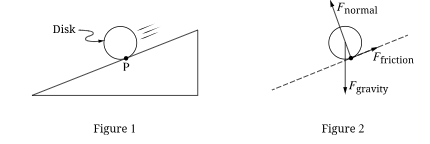 A disk rolls without slipping down an incline as shown in Figure 1. A force diagram, which represents the forces exerted on the disk and the locations at which the forces are exerted, is shown in Figure 2. At the instant shown in Figure 1, Point P, which is on the edge of the disk is in contact with the incline.