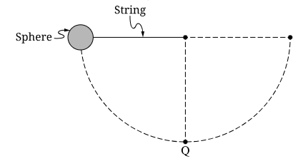 A sphere is attached to the end of a string. The other end of the string is fixed. The sphere is pulled to the left and released from rest when the string is horizontal as shown. The sphere swings through Point Q, where the string is vertical.