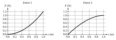 The graphs show the magnitude F of the force exerted on an object as a function of the object’s position x for two trials in an experiment. The force F is exerted in the direction of motion for both trials. W1 and W2 are the work done on the object by Force 1 and Force 2, respectively, as the object moves from x=0 to x=1.0m.