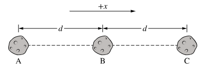 At the instant shown, three identical asteroids are in a line. Asteroid B is equidistant from asteroids A and C, as shown. The asteroids are in empty space such that the only forces on each asteroid are the forces from the other two. The positive x-direction is defined to be to the right.