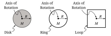 Students have a solid disk, a circular ring, and a square loop with masses and dimensions as shown. The dot at the center of the disk, ring, and loop represents the axis of rotation, which is perpendicular to the respective plane of each shape.