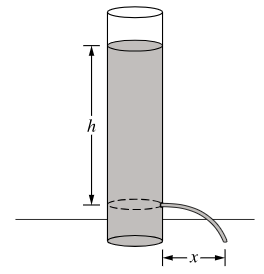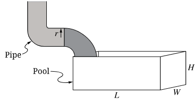 Water fills a pipe of radius r and has a speed v as it exits the pipe. The water flows into a large rectangular pool of length L, width W, and height H, as shown in the figure.