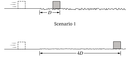 In Scenario 1, a block is sliding across a smooth surface with a constant speed v0. When the block reaches a rough section, it slows to a stop in a distance D, as shown in the figure. In Scenario 2, an identical block is sliding with the same constant speed v0 across a smooth surface. When this second block reaches a different rough surface, it slows to a stop in a distance 4D. The time it takes for the blocks to stop in scenarios 1 and 2 is t1 and t2, respectively.