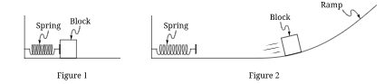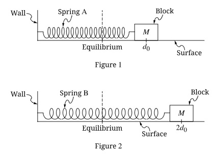 Spring A is attached at one end to a wall and at the other end to a block of mass M. The block is displaced a distance d0 from the equilibrium position of the block-Spring A system, as shown in Figure 1. With the block a distance d0 from equilibrium, the potential energy of the system is UA,1.