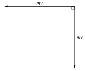 A stationary block explodes, breaking into three pieces of masses m, m, and 3m. The two pieces of mass m move off at right angles to each other with the same magnitudes of momentum mv, as shown in the figure.
