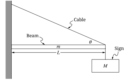 A horizontal beam of mass m and length L is attached at one end to a wall and at the other end by a cable extending to the wall. The angle formed by the cable and the horizontal is θ. A sign of mass M hangs from the end of the beam furthest from the wall, as shown in the figure.