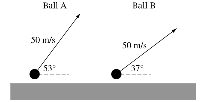 Two identical balls A and B are launched from ground level at the same time. Each is launched with initial speed of 50m/s but at different angles, as shown in the figure.