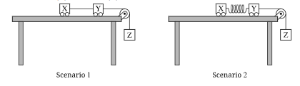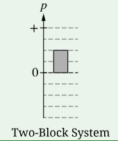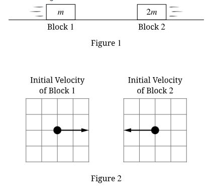 Blocks 1 and 2 slide toward each other on a horizontal track, as shown in Figure 1. There is negligible friction between the blocks and the track. Figure 2 shows a momentum bar chart that represents the magnitude and direction of the momentum of each block before they collide.