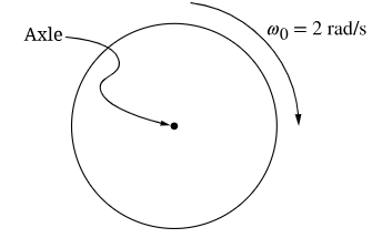 A disk with rotational inertia I=2kg⋅m2 is free to rotate around an axle perpendicular to the plane of the disk and through its center with negligible friction. At time t=0, the disk has an angular velocity ω0=2rad/s clockwise, as shown in the figure. A counterclockwise torque τ=8N⋅m is exerted on the disk from time t=0 to t=2s.