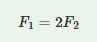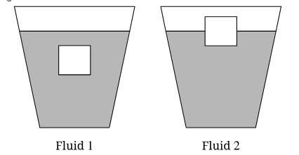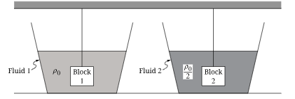 Two identical blocks, 1 and 2, are attached to strings suspended from the ceiling. The blocks are submerged in different fluids, as shown. Block 1 is submerged in Fluid 1 of density ρ0. Block 2 is submerged in Fluid 2 of density ρ02. Fluids 1 and 2 exert buoyant forces of magnitude F1 and F2 on blocks 1 and 2 respectively.
