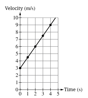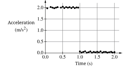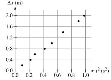 A student allows a block to slide down a long ramp from various starting positions. The student records the time t for the block to travel a displacement Δx after being released from rest. The student creates a graph of Δx as a function of t2.