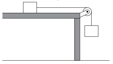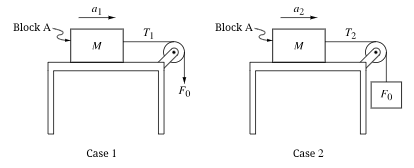 Block A of mass M initially rests on a table as shown in the figure. The force of friction between Block A and the table is negligible. Block A is connected to a string which hangs over a pulley. In Case 1 a force of magnitude F0 is exerted downward on the string. In Case 2 an object of weight F0 is attached to the end of the string. The acceleration of Block A and the tension in the string are indicated in the figure.