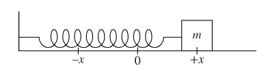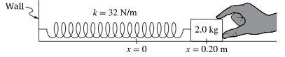 A spring with a spring constant of 32N/m is attached to a wall. A block of mass 2.0kg is connected to the free end of the spring, as shown. The block is displaced 0.20m from the equilibrium position of the block-spring system which is located at x=0. The block is released from rest, and it oscillates on a horizontal surface where friction between the surface and the block is negligible.