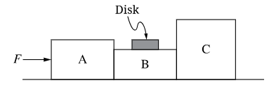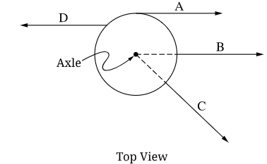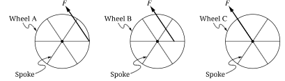 Three identical wheels, A, B, and C, each have six regularly spaced spokes. A net force of magnitude F is exerted on each wheel, as shown in the figure.