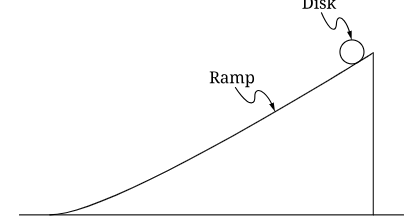 A disk of mass m and radius R is released from rest at the top of an incline and rolls down without slipping, as shown in the figure. While the disk is rolling it experiences an angular acceleration αdisk. Just before the disk reaches the bottom of the incline the velocity of the center of mass of the disk is vdisk. The experiment is repeated with a hoop of mass m and radius R. While the hoop is rolling it has an angular acceleration αhoop. Just before the hoop reaches the bottom of the incline, the velocity of the center of mass of the hoop is vhoop.