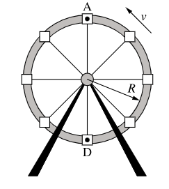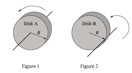 A uniform disk, Disk A, of mass m and radius R rotates about an axis through the disk’s geometric center as shown in Figure 1. The rotational inertia for the disk in this configuration is I=12mR2. An identical disk, Disk B, rotates about an axis that passes through the edge of the disk, a radial distance R from the center of the disk as shown in Figure 2. The same torque is exerted on both disks, and disks A and B experience angular accelerations αA, and αB, respectively.