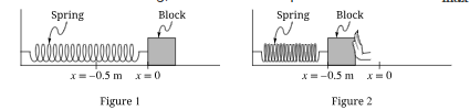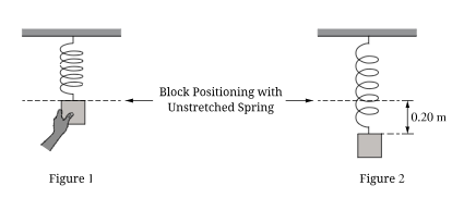 A 1.0kg block is attached to an unstretched spring of spring constant 50N/m and released from rest from the position shown in Figure 1. The block oscillates and eventually stops moving 0.20m below its starting point, as shown in Figure 2.