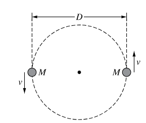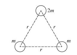 Three spheres, with masses indicated in the figure, are initially far away from each other, and the gravitational potential energy of the three-sphere system is zero. The spheres are then brought together until each sphere is a distance r from the other two, as shown.