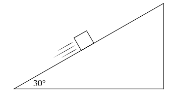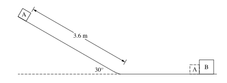 Block A of mass 2.0kg is released from rest at the top of a 3.6m inclined plane at an angle of 30°, as shown in the figure. After sliding down the incline and across the horizontal surface, Block A hits and sticks to Block B, which is initially at rest and has mass 3.0kg. Assume friction is negligible.