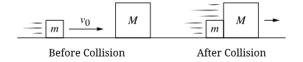 At time t=t0, a slow-moving cart of mass mC is traveling to the right at speed v0. At time t=t1 a student drops a box of mass mB onto the cart. The box does not bounce but slides backwards relative to the cart. At time t=t2 the cart and box travel together at speed vf without slipping.