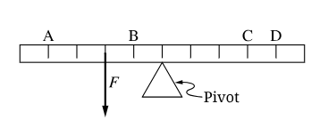 The figure shows a uniform meterstick that is set on a pivot at its center. A force of magnitude F toward the bottom of the page is exerted on the meterstick.