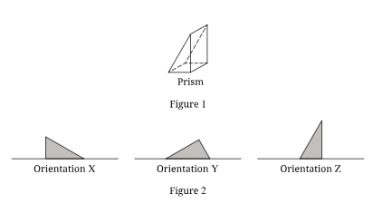 A solid prism in the shape of a right triangle as shown in Figure 1, can be placed in any of the three orientations shown in Figure 2. The prism is placed in a large tank containing a liquid and the prism sinks to the bottom of the tank. FX is the magnitude of the buoyant force exerted on the prism by the liquid in the tank when the prism is in Orientation X. FY and FZ are the buoyant forces for orientations Y and Z.
