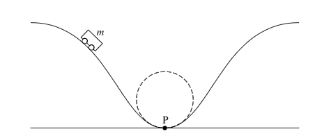 A cart of mass m rolls down a track and through the circular bottom of the track (Point P) as shown in the figure.