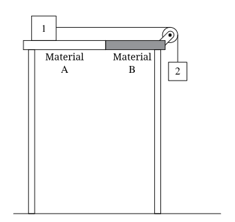 Blocks 1 and 2 are connected by a string that passes over a pulley with negligible mass and friction, as shown in the figure. Block 1 is on a table covered with two different materials, A and B. The two-block system is released from rest, and the speed of Block 1 begins to increase. When Block 1 reaches Material B, its speed increases at a greater rate.