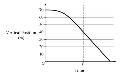 A rock with mass 2kg is dropped from the top of a building and falls straight down. The graph shows the vertical position of the rock as a function of time. From time t=0 to t=t1, the force of air resistance does −80J of work on the rock.