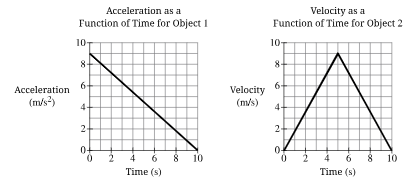 Graphs of the motion of two identical objects 1 and 2 are shown in Figure 1 and Figure 2, respectively. The change in velocity of Object 1 from t=0 to t=10s is Δv1. The change in velocity of Object 2 during the same time is Δv2.