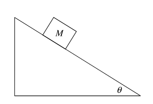 A block of mass M is released from rest near the top of a ramp that is inclined at an angle θ with the horizontal as shown in the figure. The block slides down the ramp with negligible friction, traveling a distance d in a time t. The angle of the ramp is then decreased.